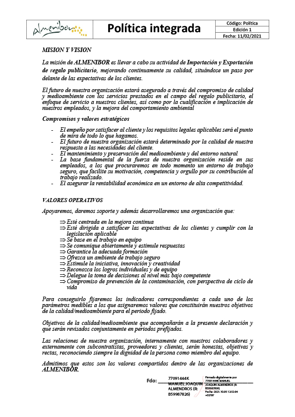Almenibor tiene como misión mejorar su calidad y potenciar el compromiso de nuestros empleados y con el medio ambiente.